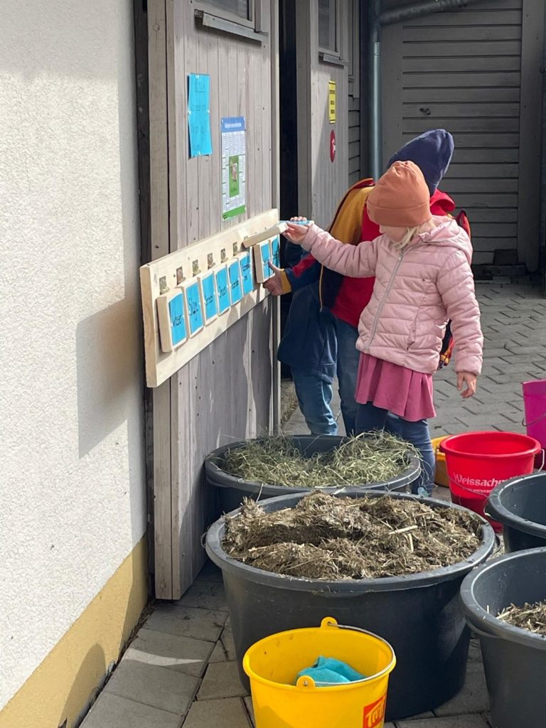 Der Kindergarten besteht aus einer Gruppe mit maximal 20 Kindern ab 3 Jahren. Die Kinder kommen täglich für eine halbe Stunde auf den Hof und dürfen dort helfen, die Kühe und Kälber zu versorgen. Für die Kinder wurde ein kleines Häuschen errichtet, in das sie sich an kalten Tagen zurückziehen können. Ansonsten verbringen sie den Tag normalerweise im Garten, wo sie 3 Hasen und 20 Hühner, sowie einen großen Sandkasten und Beete zum Anpflanzen von Gemüse haben.