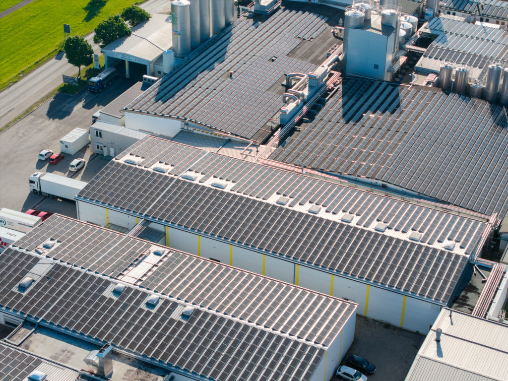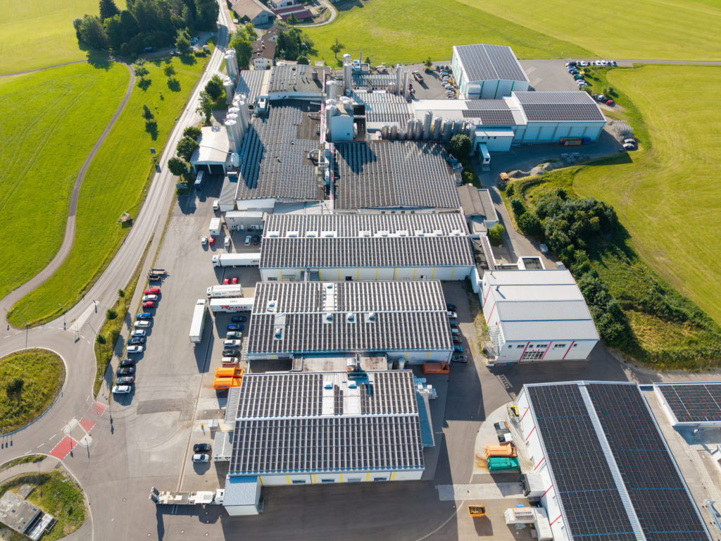 Bereits heute sind 90% unserer Dachflächen mit Photovoltaikanlagen versehen Dadurch wurden 2024 ca. 7% des Stromverbrauchs durch eigene PV-Anlagen abgedeckt Bis 2027 soll die Versorgung mit PV-Strom aus eigenen Anlagen auf 20% erhöht werden. Die Stromerzeugung mit Hilfe PV-Anlagen deckt sich sehr gut mit unserem Strombedarf für Kälteerzeugung, welche an sonnigen Tagen signifikant höher ist.