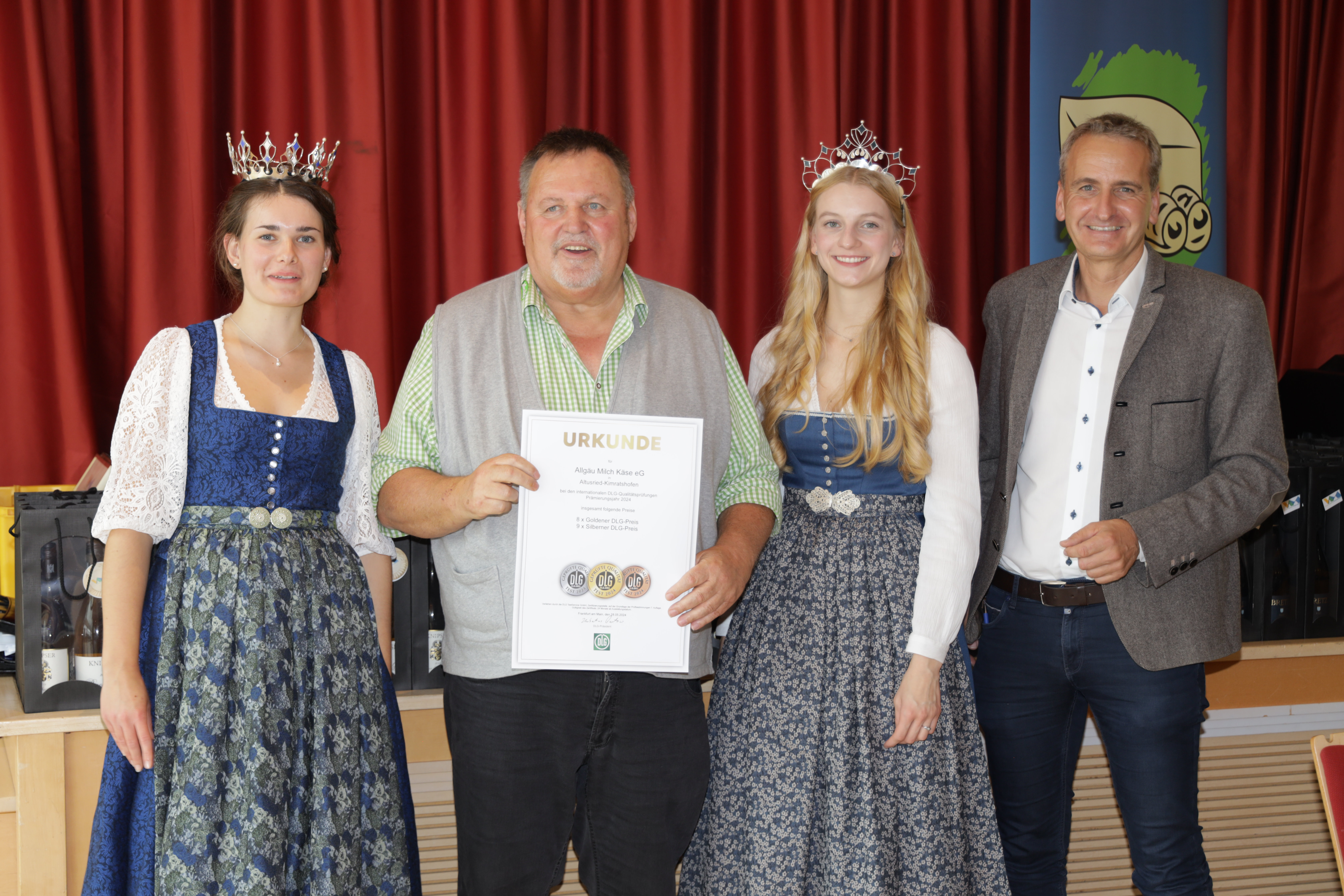 Wir freuen uns, dass unsere Milchprodukte bei den internationalen DLG (Deutsche Landwirtschafts-Gesellschaft)-Qualitätsprüfungen im Prämierungsjahr 2024 für ihre hervorragende Qualität ausgezeichnet wurden. Stellvertretend überreichte Rudolf Seipelt mit der Bayerischen Milchkönigin und der Bayerischen Milchprinzessin Hubert Dennenmoser eine Urkunde für 8 Goldene und 9 Silberne Preise.