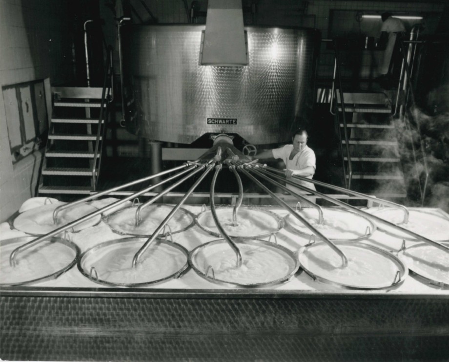 Nicht nur durch seine Größe, sondern durch seine Innovationskraft. Mit dem Viereckhartkäse wurde eine neue Käseform entwickelt, die den Anforderungen moderner Märkte entspricht. Dabei bewiesen die Verantwortlichen großes Fingerspitzengefühl: Technischer Fortschritt wurde nicht zum Selbstzweck, sondern stets so gestaltet, dass er den Genossenschaftsgedanken stärkte und die regionale Identität bewahrt. Was alle einte, war das Ziel, gemeinsam voranzugehen, ohne dabei die bäuerlichen Wurzeln zu verlieren. Der Mensch stand ebenso wie heute im Mittelpunkt, nicht die Masse. Dadurch blieb das Allgäu Herzstück und Heimat aller Entscheidungen.
